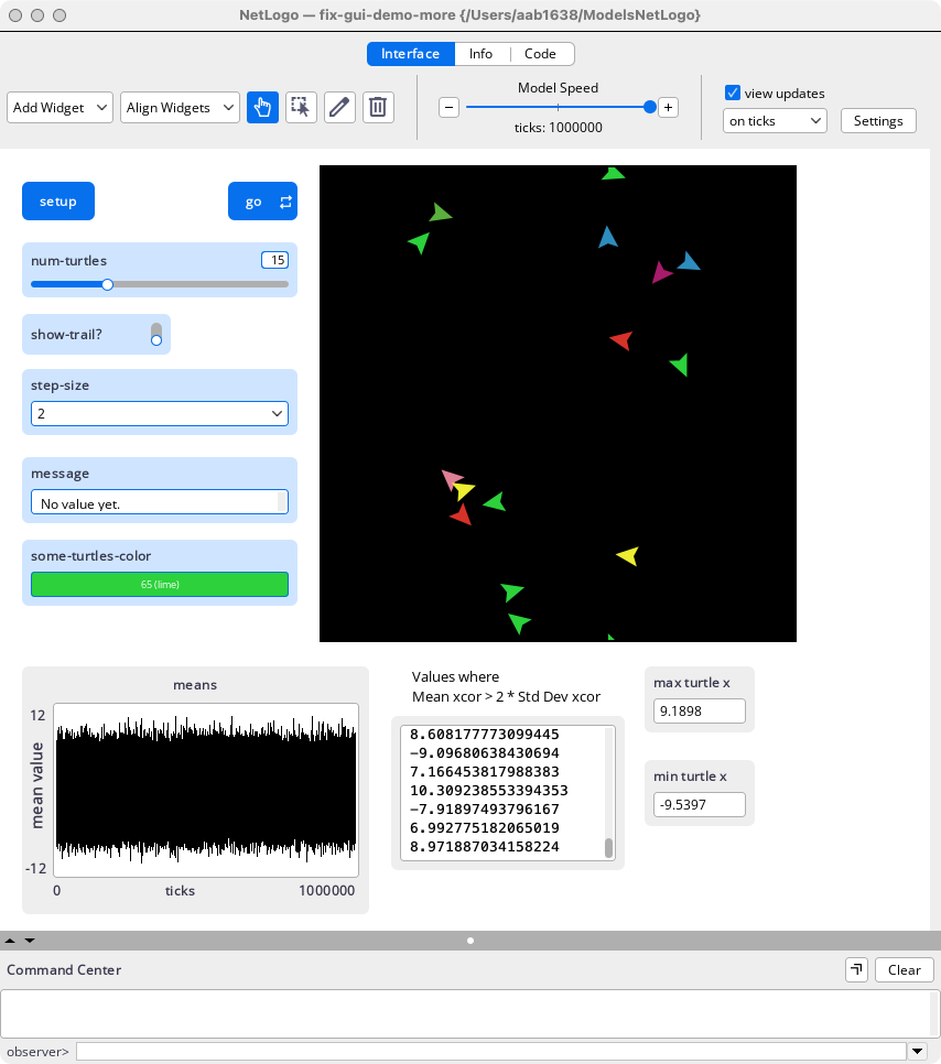 By default NetLogo will now collect anonymous usage statistics from users while the application is running. Uncheck this option to disable data collection. When this option is enabled, NetLogo will collect information about your usage of tools and features of the NetLogo application and the NetLogo language. This information is analyzed by the NetLogo team in order to understand how often certain NetLogo features are being used, so as to inform development priorities. No personal or identifying information will be collected. If you have any questions or concerns about the collection and storage of this data, feel free to contact the NetLogo team at feedback@ccl.northwestern.edu.