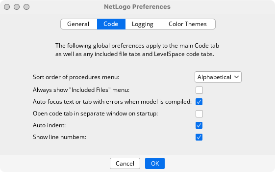 Use the check boxes, pull-down menus and text fields to change the default preference values. When you are done, click the OK button to save your changes, or the Cancel button to revert the preferences to the state they were in before you opened the dialog. Most preferences take effect immediately. You must exit and re-open NetLogo for the preferences that indicate “(restart required)” to take effect.