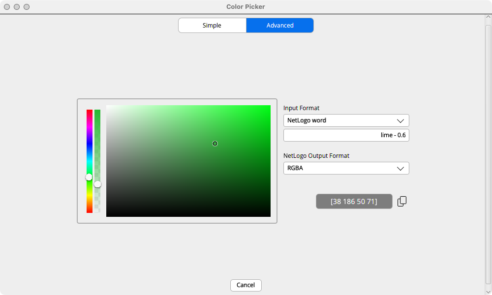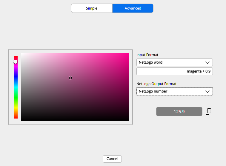 As shown below Simple tab for the Color Input adds a blue ‘OK’ button to the right of ‘Cancel.’ Choosing ‘OK’ changes the Input to the selected color, exiting the dialog. ‘Copy’ puts the NetLogo Color number corresponding to the selected color in the clipboard. It can then be copied to the Code Tab, or any other text area. The dialog remains open. Cancel closes the dialog without changing the color input widget.
