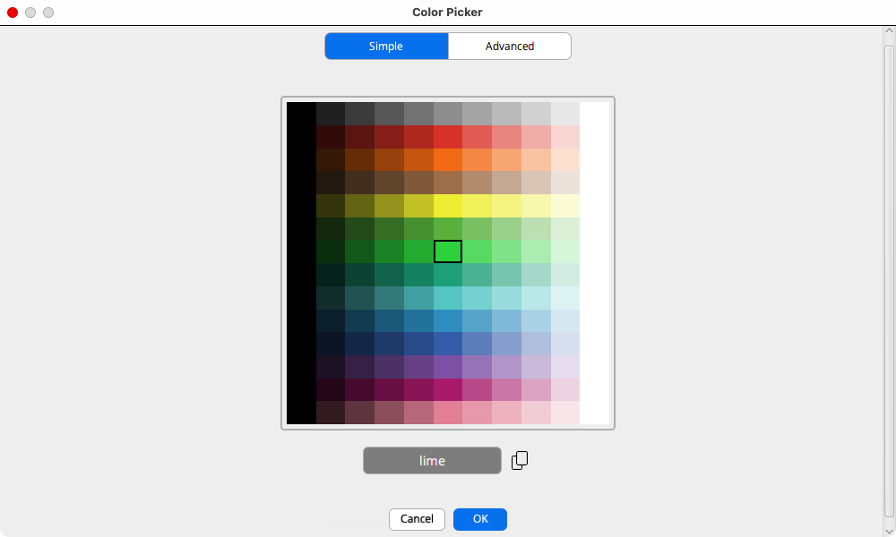 All versions of the Color Picker have two tabs, Simple, and Advanced. The Simple tab allows users to pick a color from a rectangular grid. This is analogous to the Color Swatches dialog, although it is more visually streamlined.